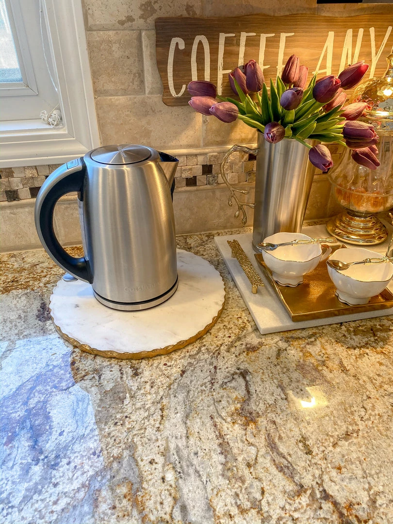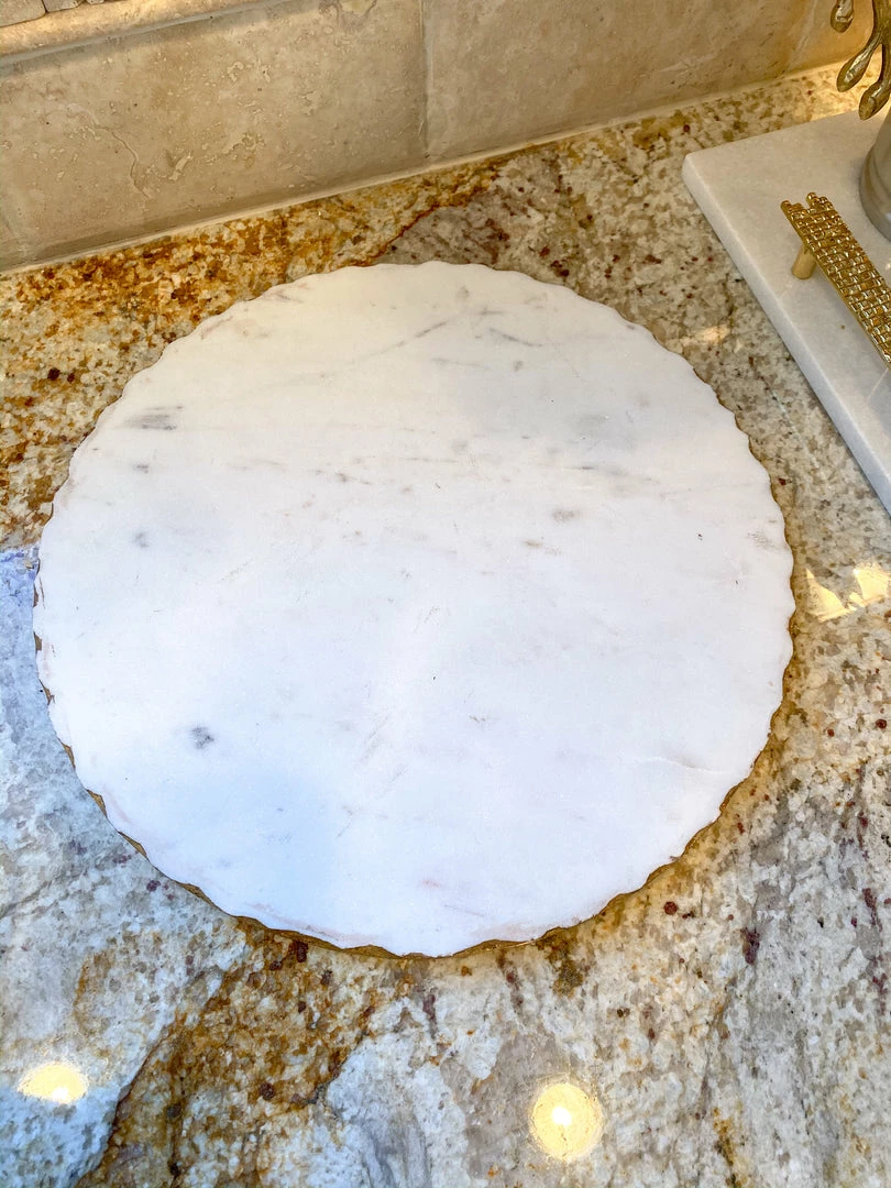 This round marble tray is a must-have for your coffee station or centerpiece! The shape makes it an interesting base for any vignette.