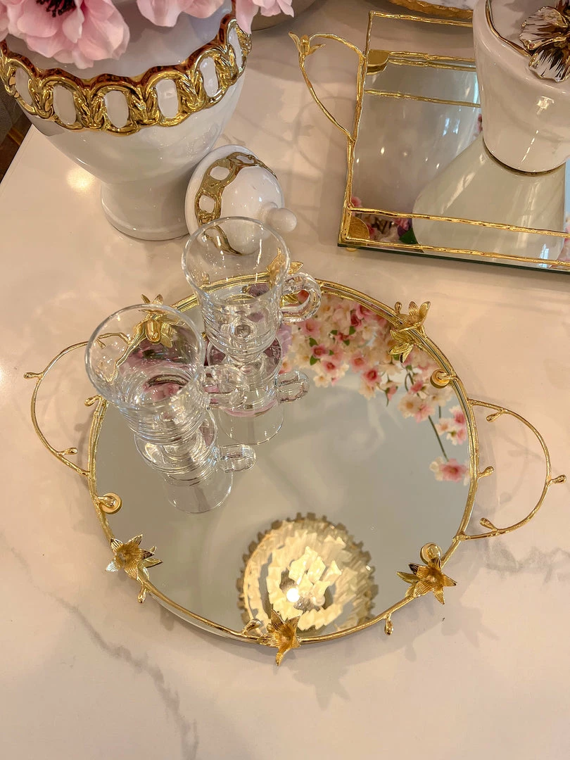 Description: This is a round mirror tray with stunning gold flower details and handles.
