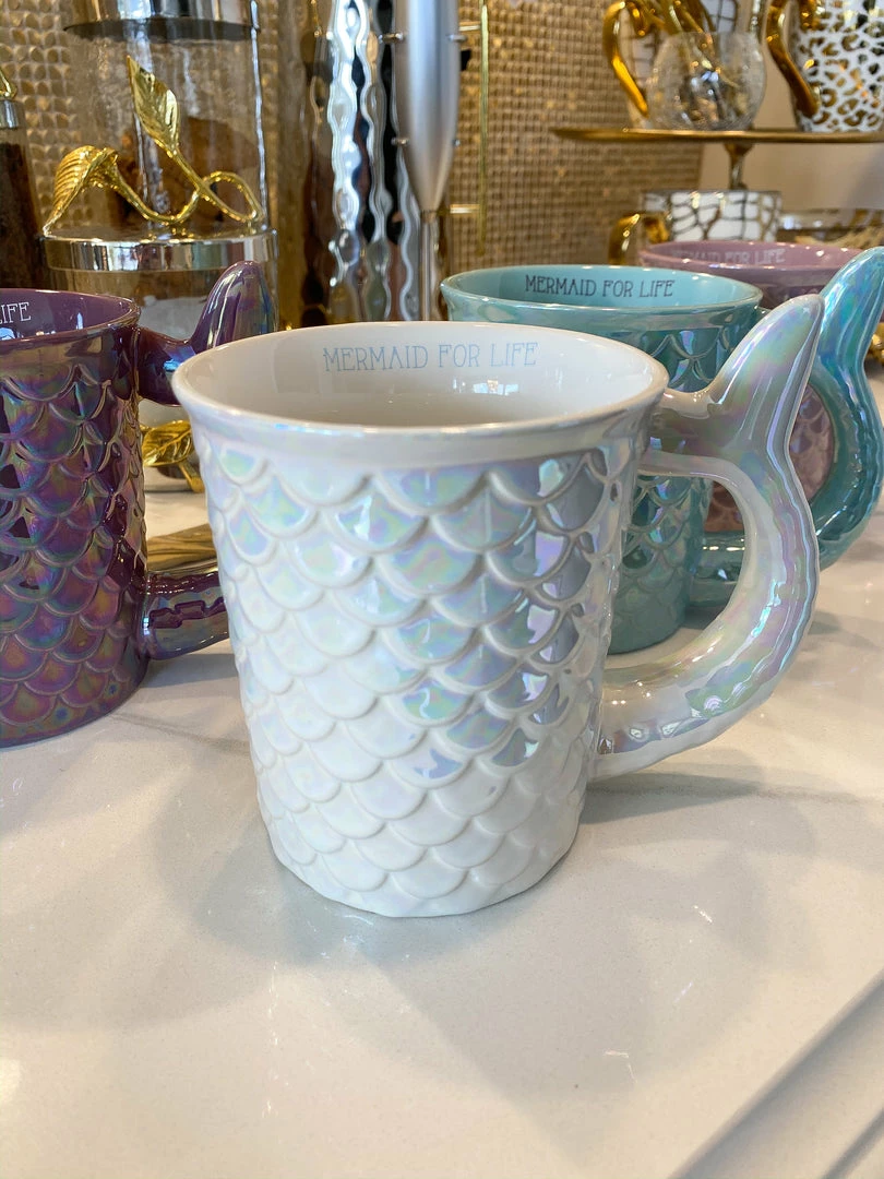 This set of 4 Mermaid Mugs are SO cute! They come with the following colors: Pink, Purple, Teal, and White and they all feature a pearl finish, a mermaid tail handle, and “Mermaid for Life” on the inner lip.