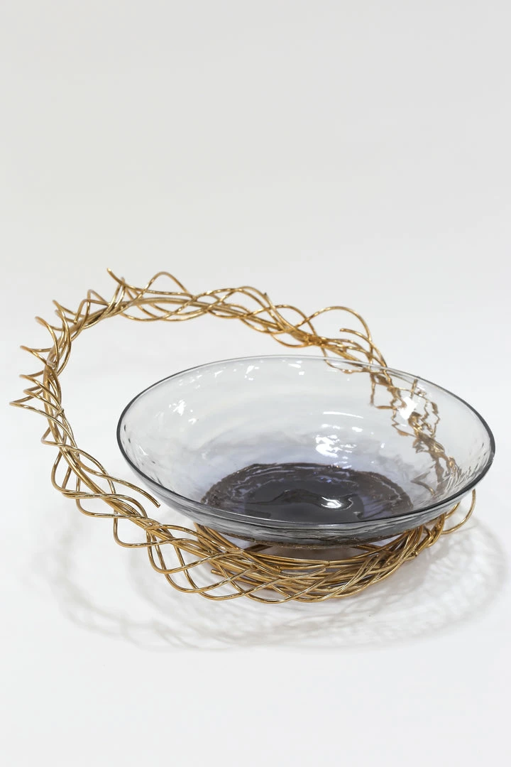 Description: This elegant shallow glass and metal detailed bowl is so beautiful. It can be used in an array of ways, from holding fruits, to your favorite bowl fillers.