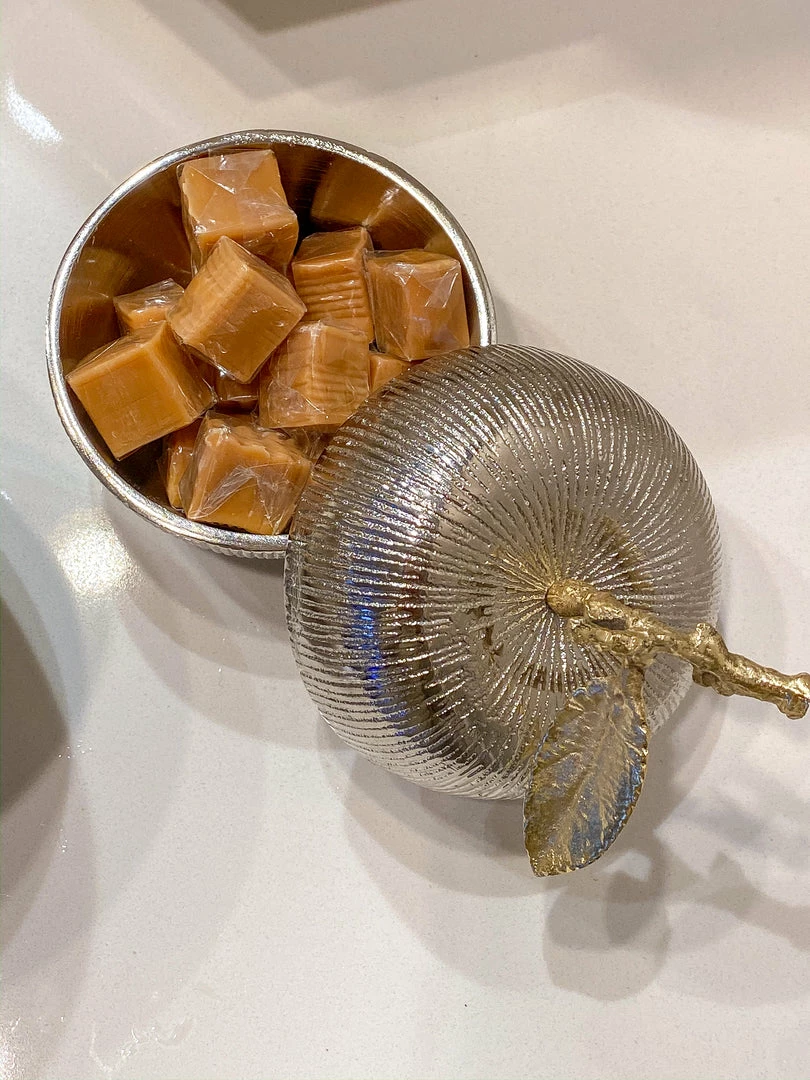 Description: Hide your trinkets and snacks in this adorable apple jar! A shiny silver apple is topped off with a gold stem abd leaf making this easy to blend into your existing home decor, and adds a cute fruity touch of glamour!