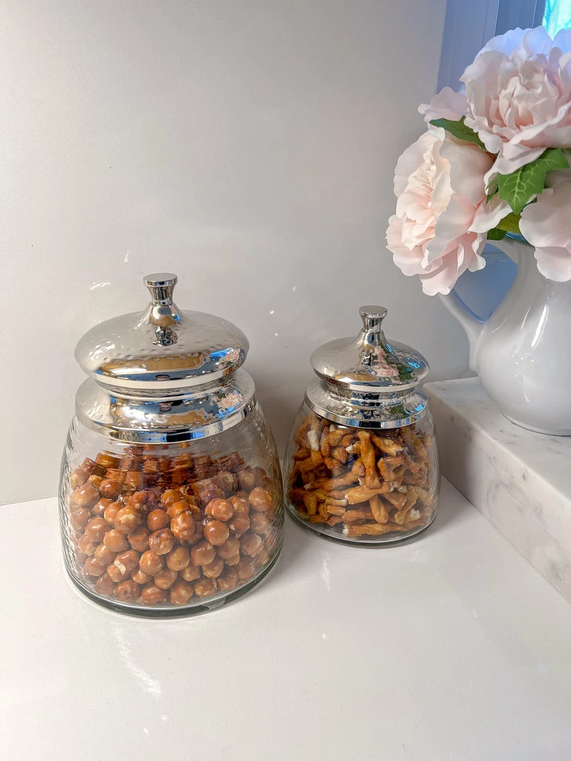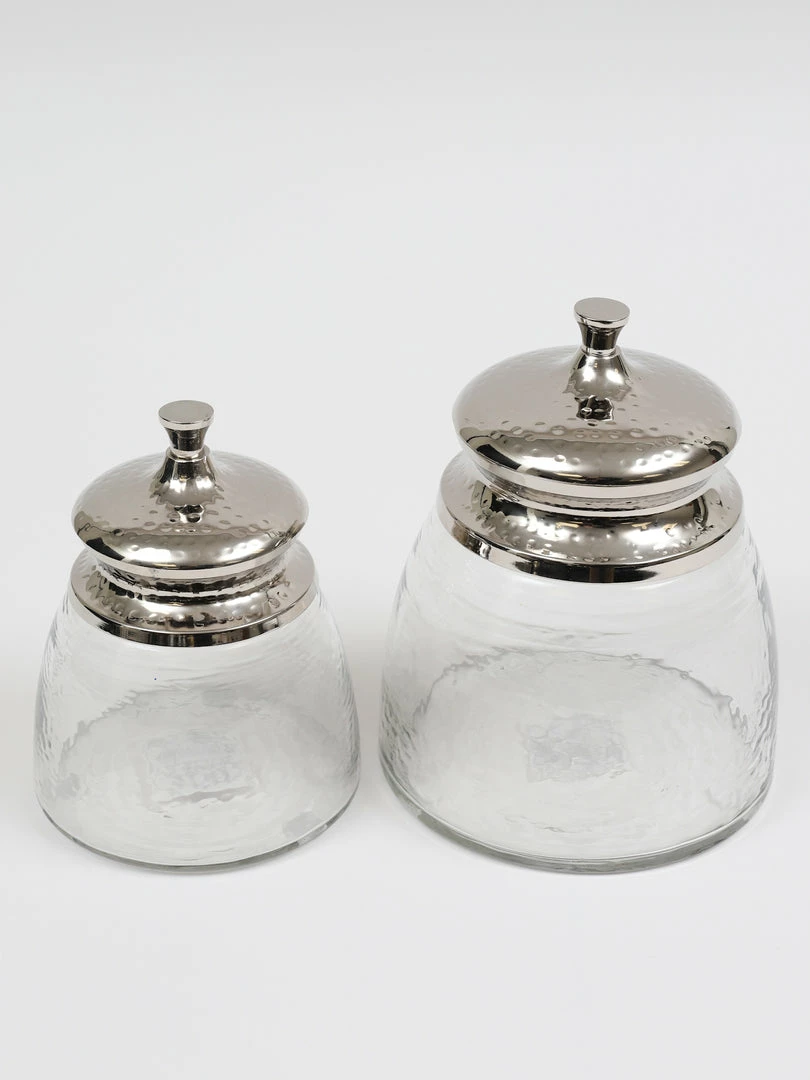 Description: This hammered glass jar with a silver plated lid can be used for so many things. Store your bathroom items or your favorite snacks.