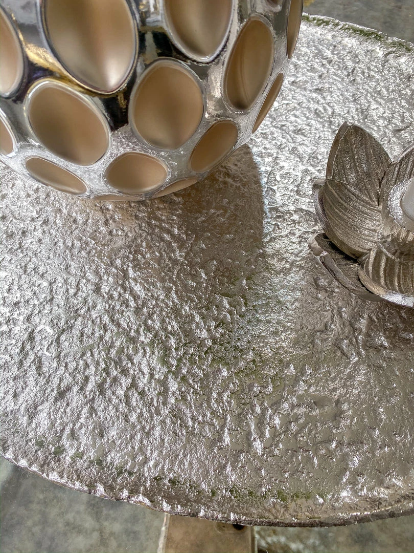 Description: This textured metal tray brings a fun organic texture to any vingette. Use it to style your favorite vase and floral arrangement and style on your coffee table or buffet. Comes in gold and silver.