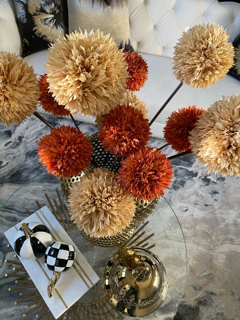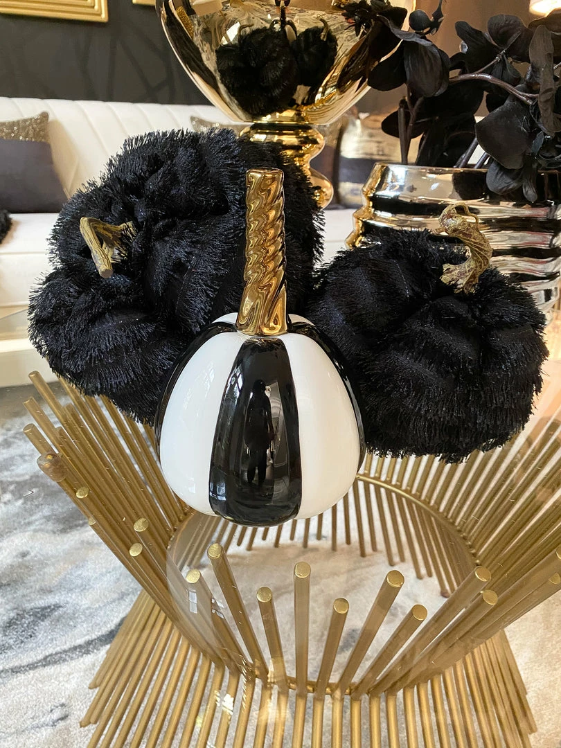 Description: This striped, black and white pumpkin with gold stem is a fun piece to add to your fall decor!