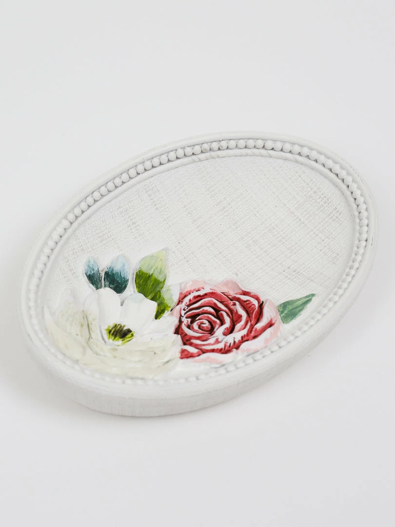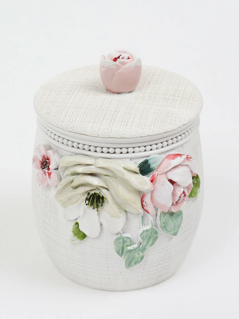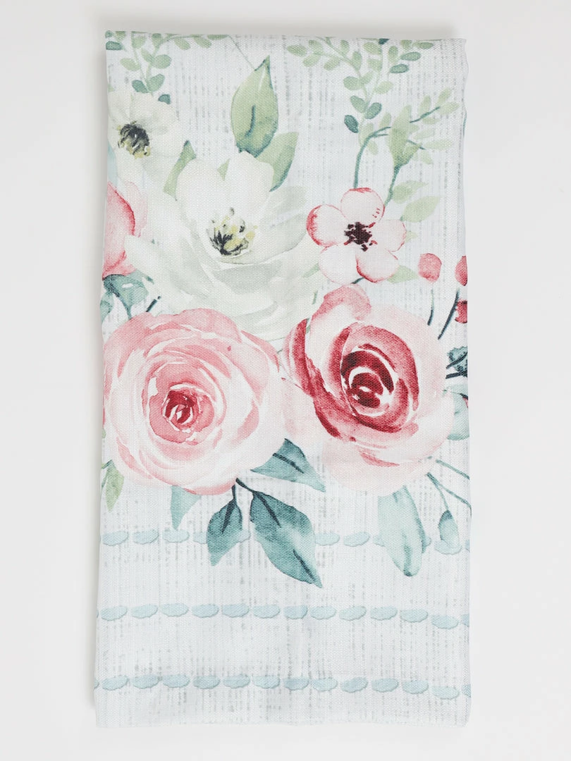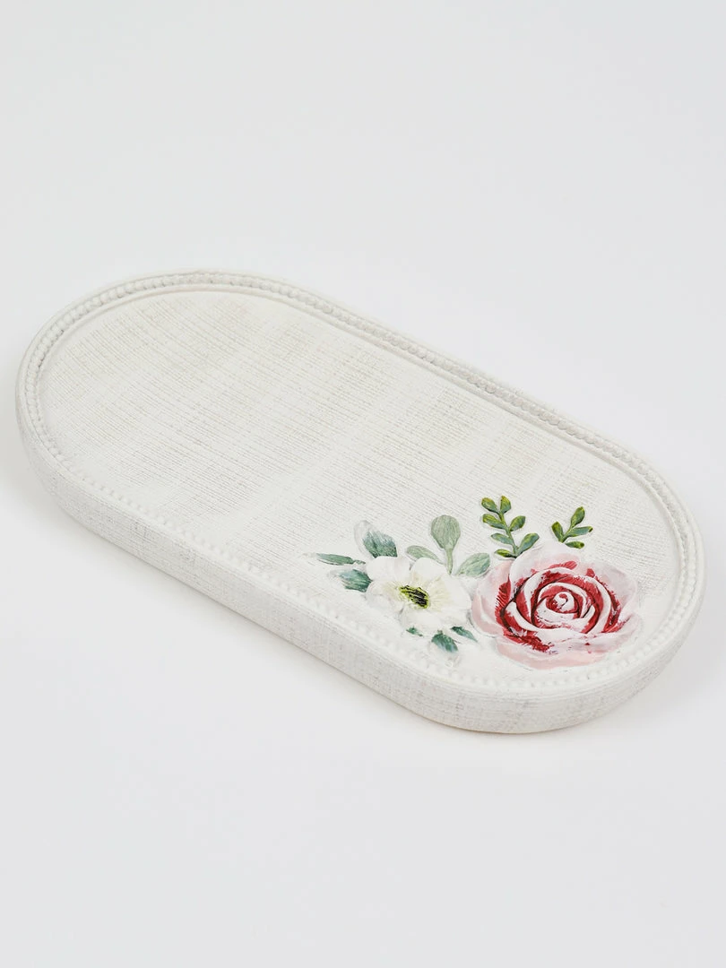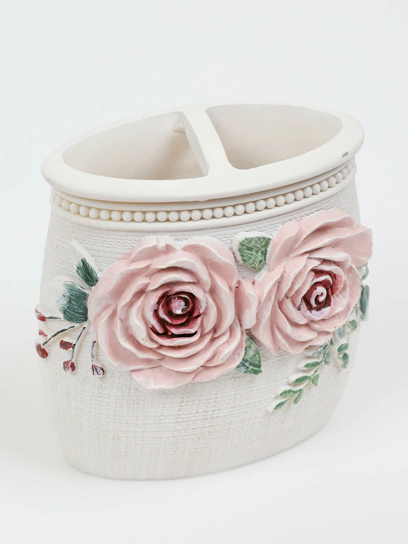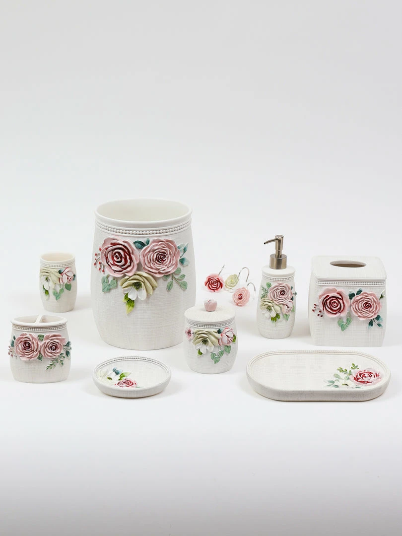 Beautiful bath accessories in hand-painted dimensional resin – the flowers almost come alive – on a textured off-white base. The shower curtain is printed with an oversized floral pattern with the leaves cascading toward the bottom on white background. The rug is tufted in 100% cotton in the shape of a rose in various shades of pink and white and everything coordinates perfectly with the bath, hand, and fingertip embroidered decorative towels.