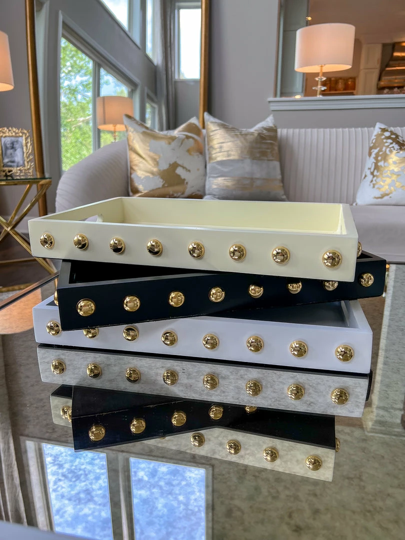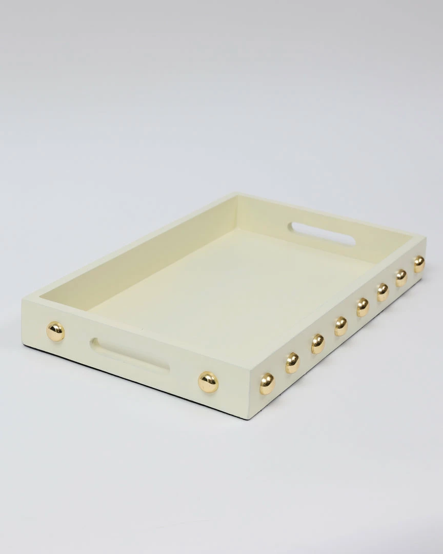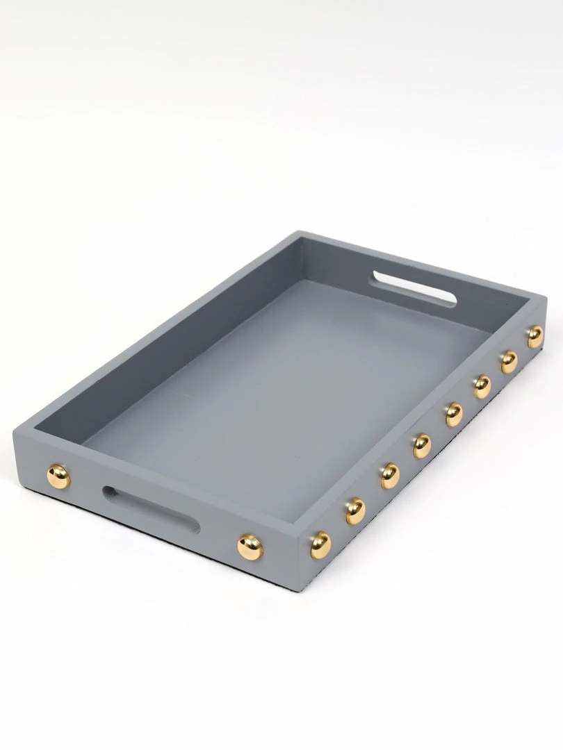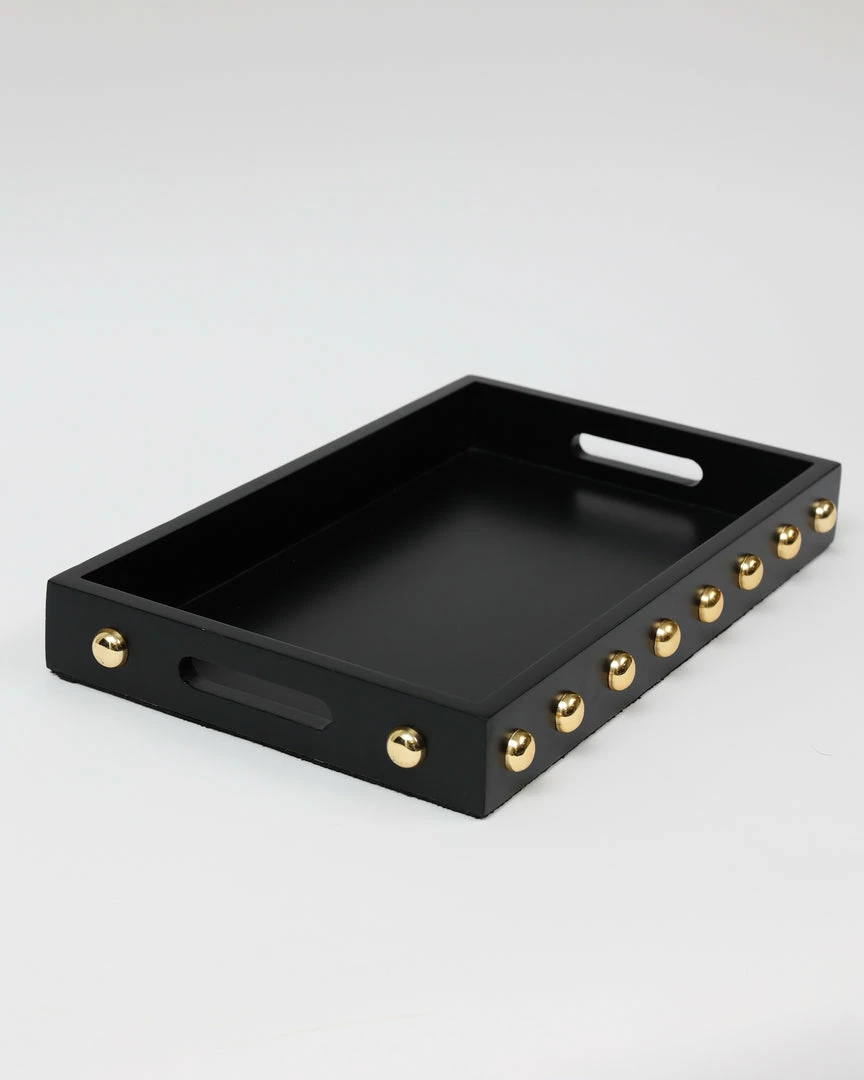 Description: This wooden tray with its shiny gold studs is a statement maker.