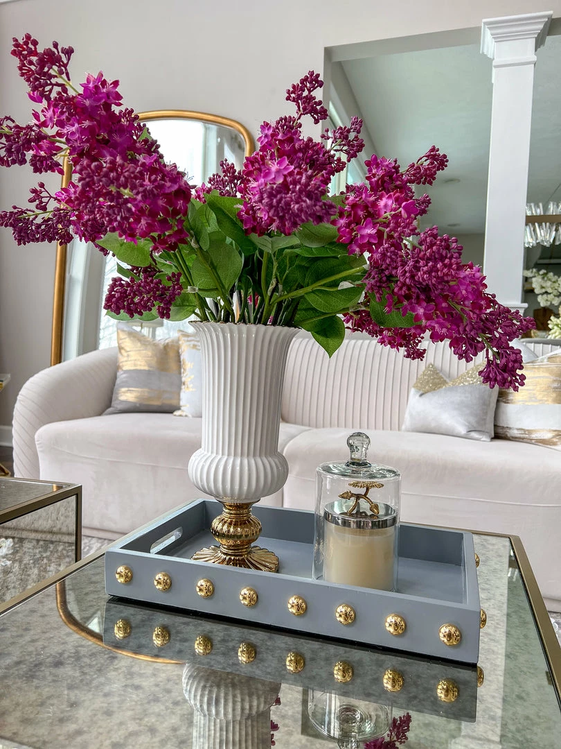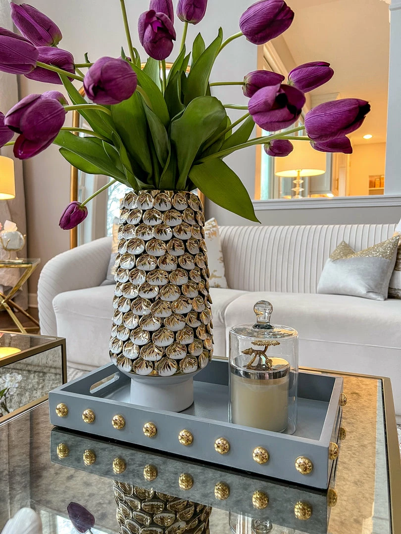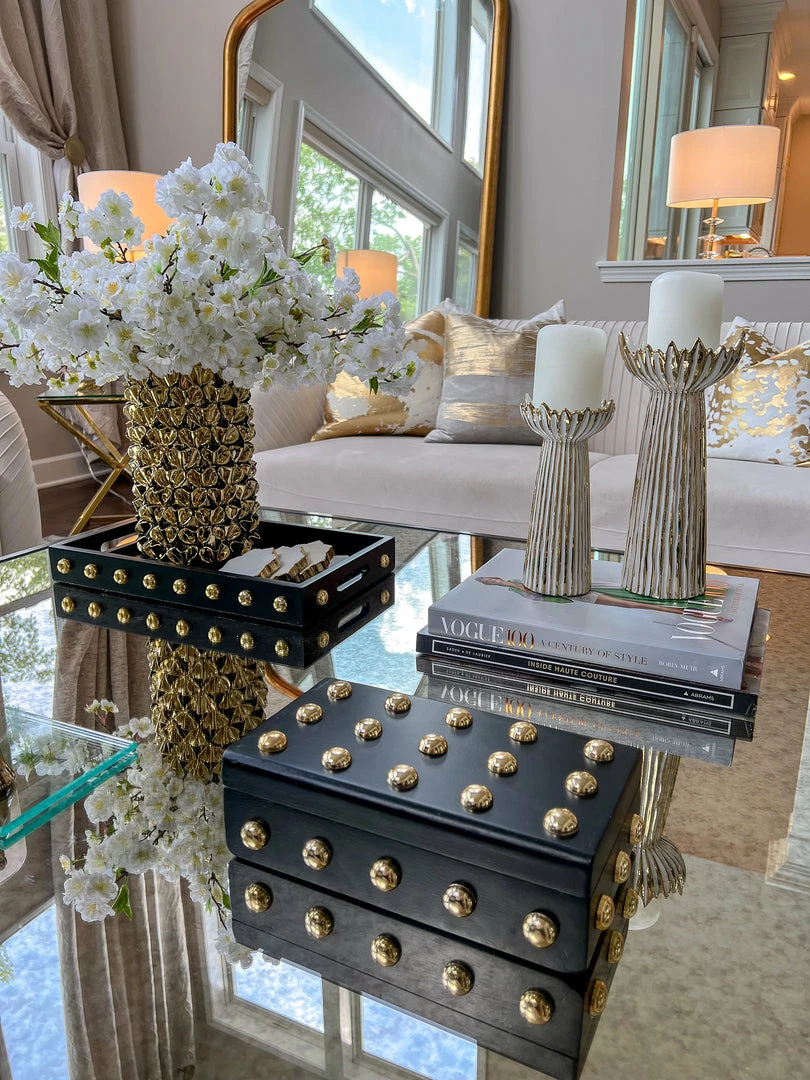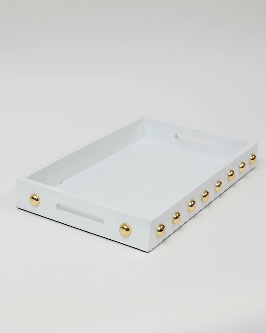 Description: This wooden tray with its shiny gold studs is a statement maker.