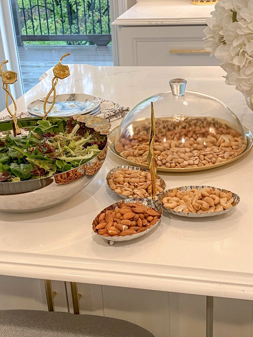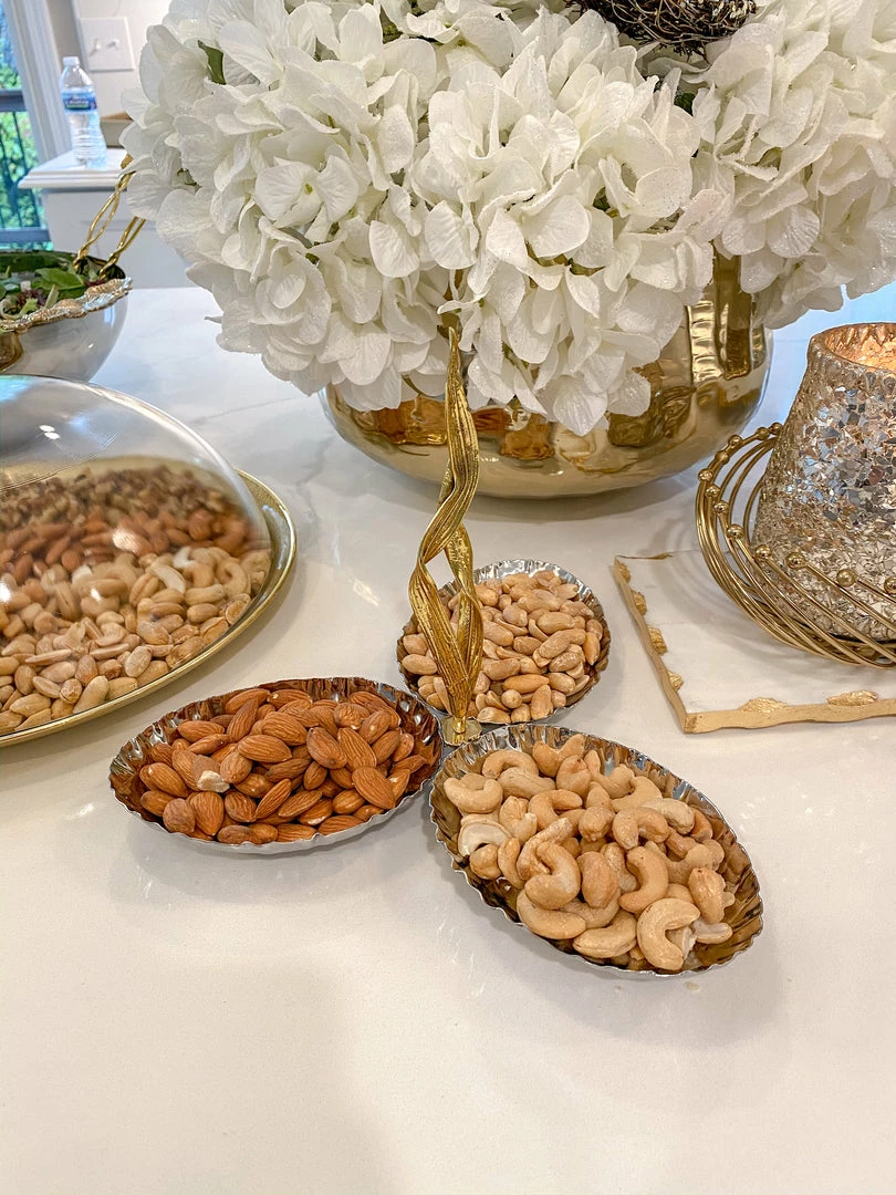 This three secion bowl has a gold branch stem. It can be used as a home decor accent piece, a nut or a fruit bowl. Add sophistication to any home!