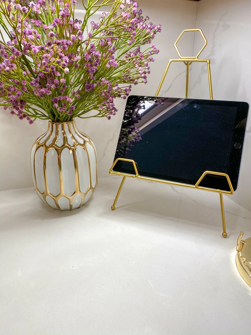 Description: This beautiful pattered vase is an excellent addition to your home decor. The white and gold accents will blend seemlessly into your existing space, and beautful showcase your favorite floral arrangements!