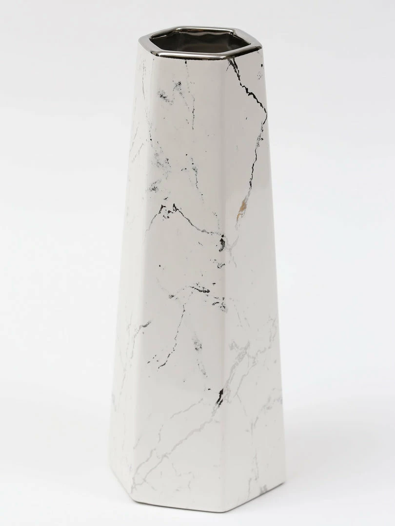 Description: We are loving this white and silver marble design vase! It provides and clean and elegant look to your home! Perfect height for all your faux florals.