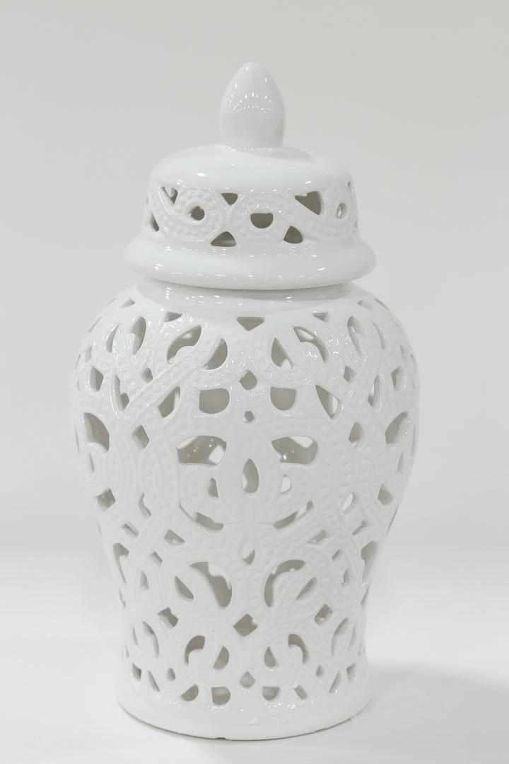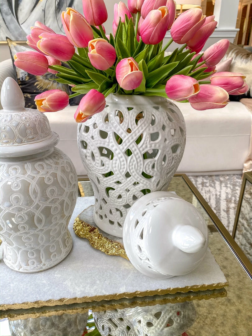 Description: This white beaded ceramic ginger jar is perfect for spring! It is 15″ tall and gives height to your vignette.