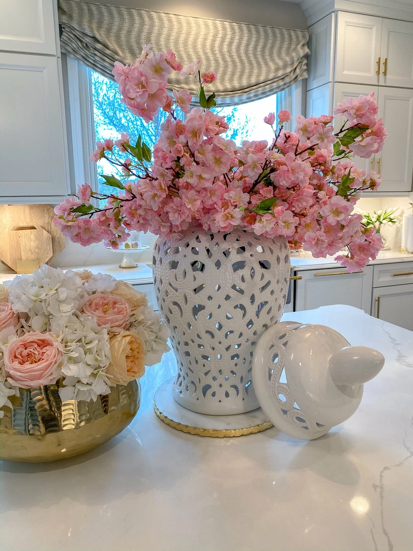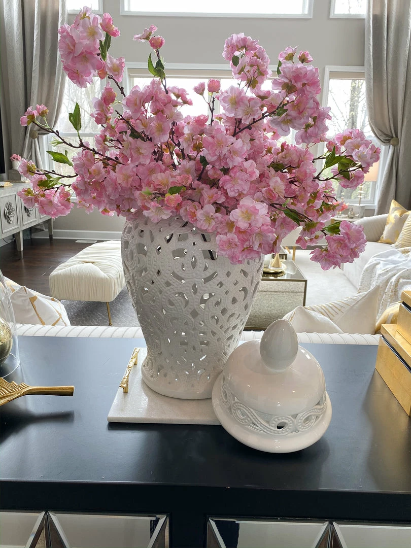 Description: This white cut-out ceramic ginger jar is perfect for any decor! It is 24″ tall and gives height to your vignette.