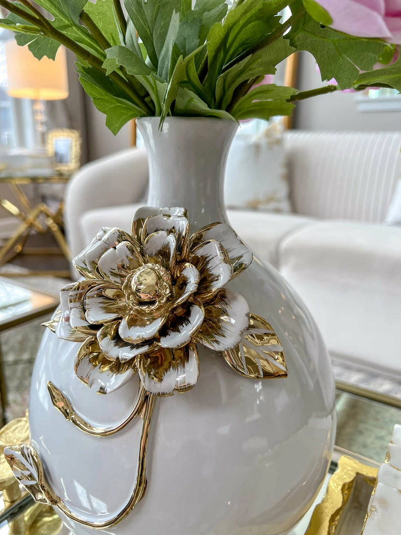 Description: This vase features a stunningly intricate gold floral design that is so unique! What a perfect way to style your favorite floral arrangement!