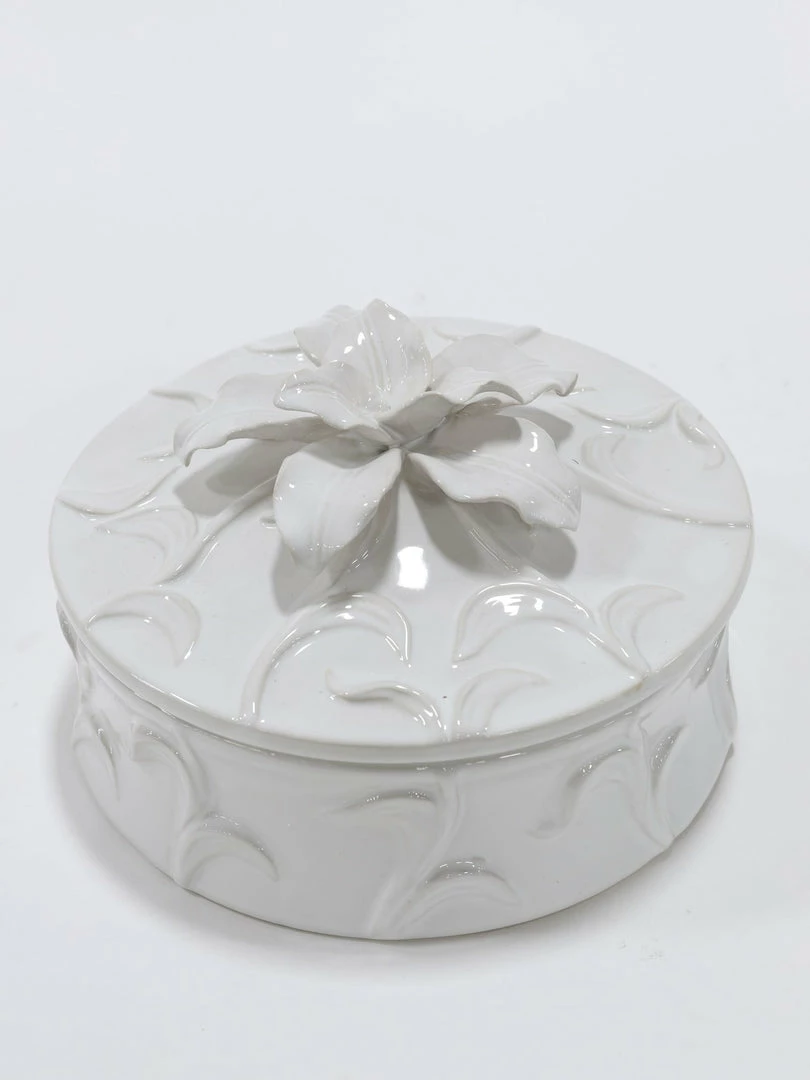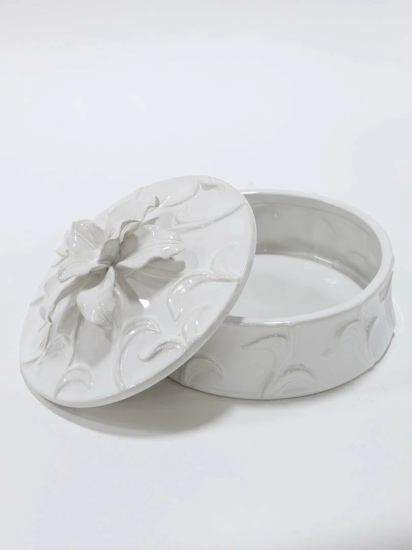 Descriptions: This ceramic floral box is just beautiful. This round box features a covered lid with a stunningly detailed flower at the top of the box.