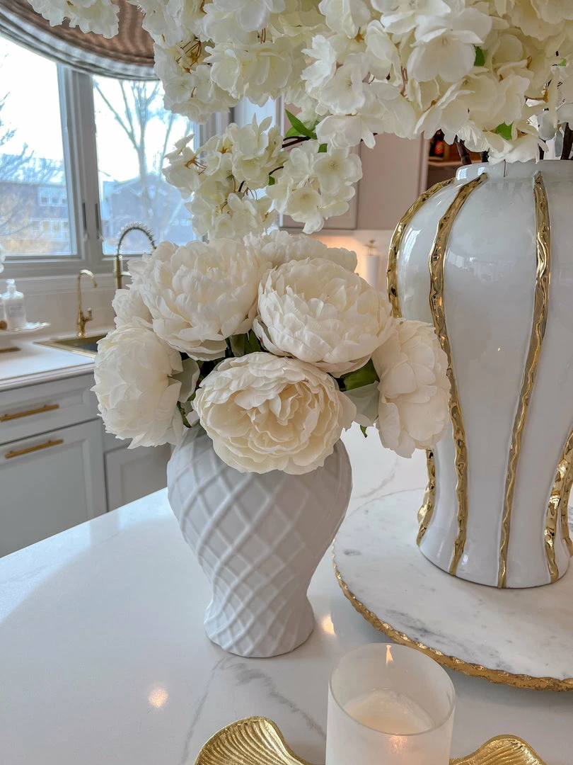 Description: This stunning ginger jar features a beautiful diamond design throughout, even incorporated into the lid! The creamy white color will make any floral arrangement pop!