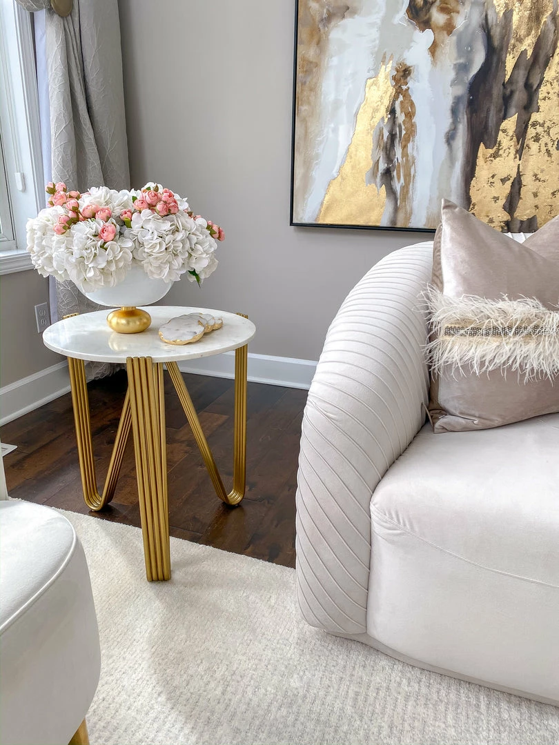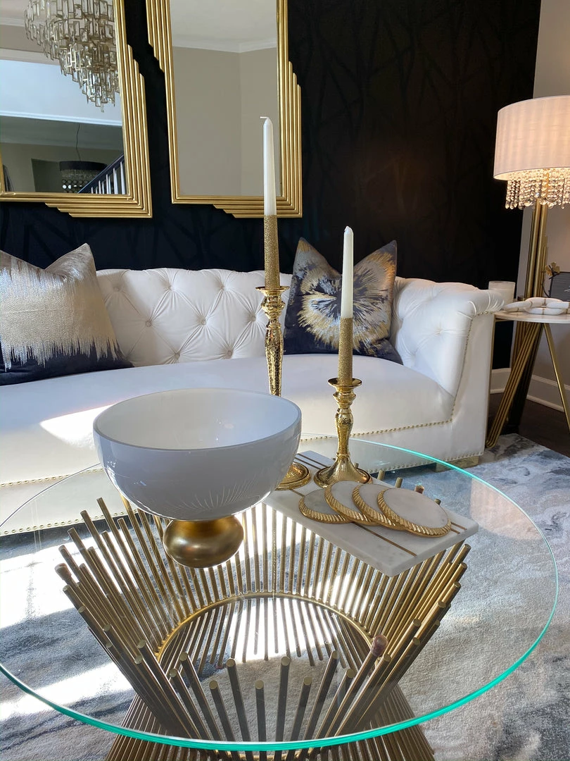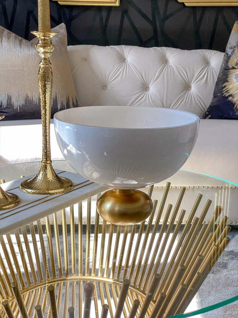 This white glass bowl features a rounded gold base and has a modern transitional feel to it! Loving the white and gold combo!