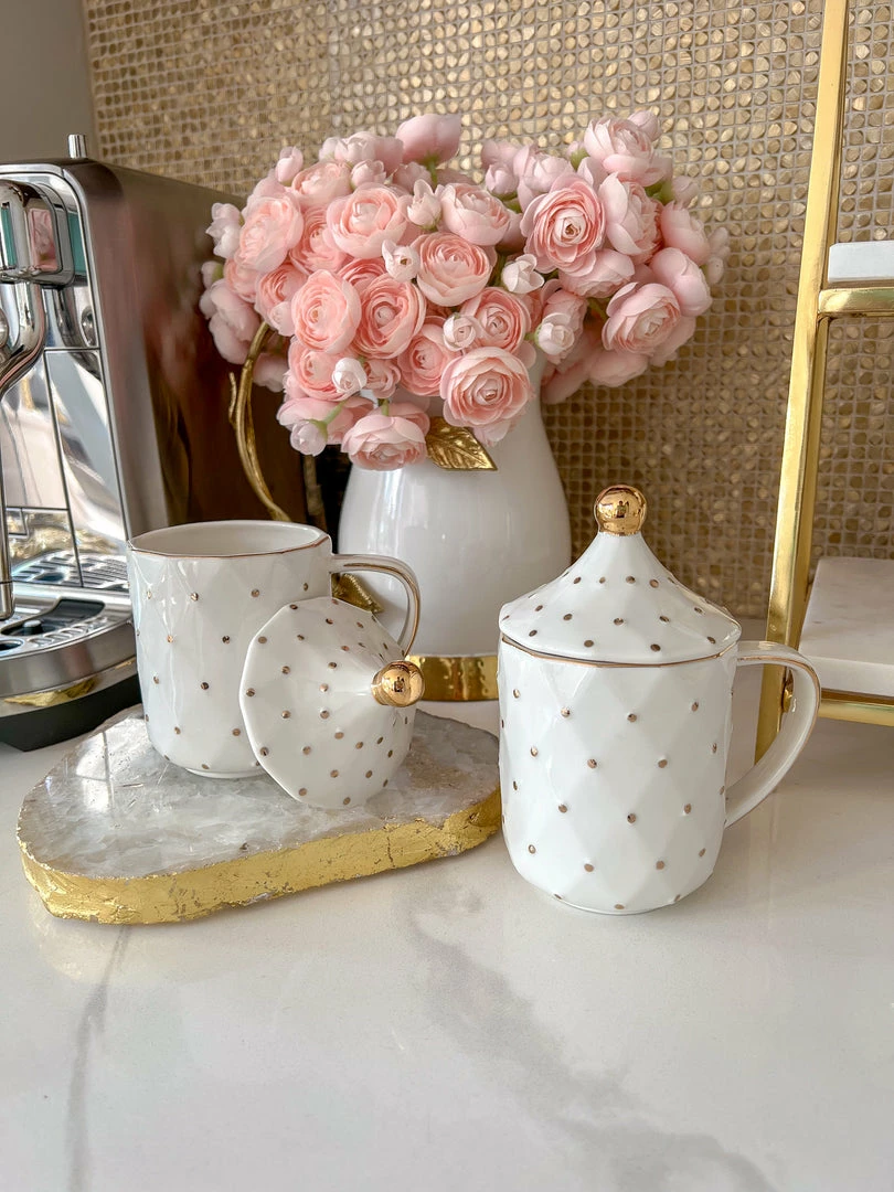Description: This white and gold dotted mug with a matching lid has a timeless look and is sure to elevate your coffee station!