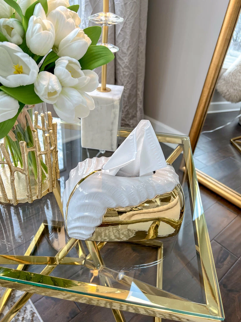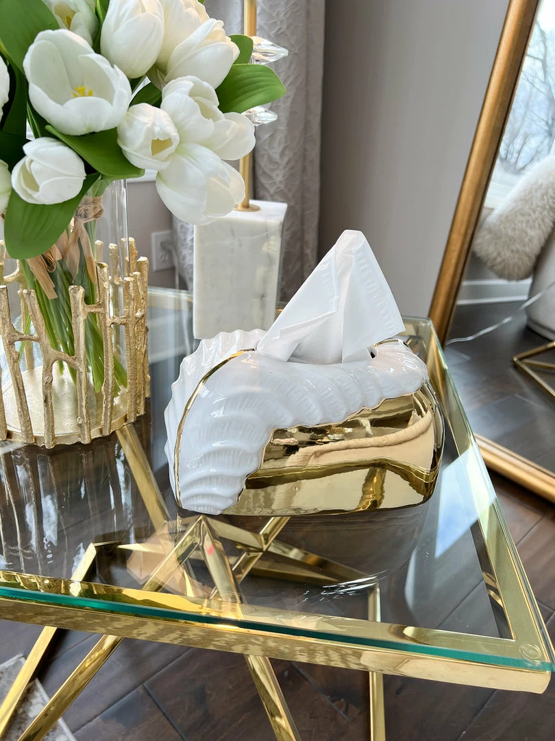 Description: This tissue box cover is the most stylish way to dress up your room! We love the gold and white textured detail on it!
