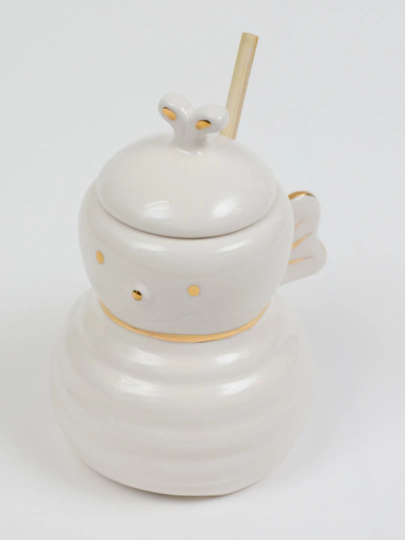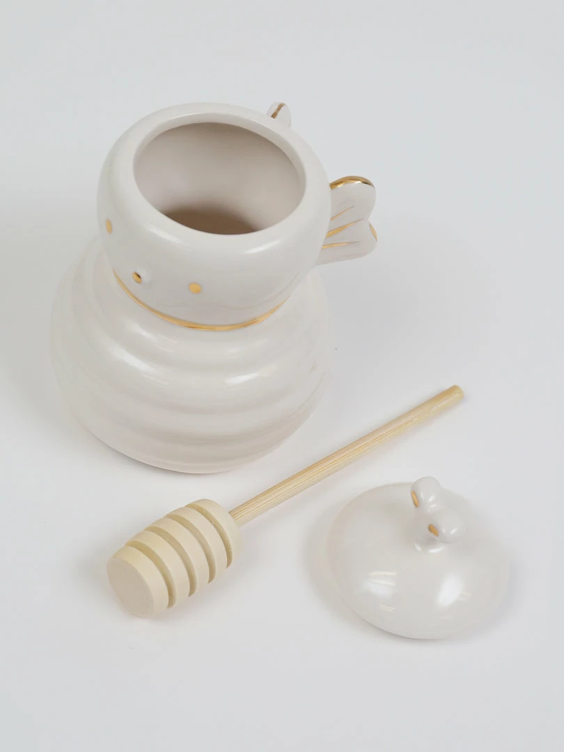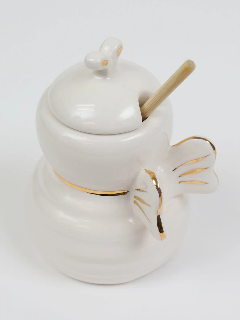 Description: This white ceramic honey bee jar features a wood honey dipper. This is just the cutest honey jar we’ve ever seen.