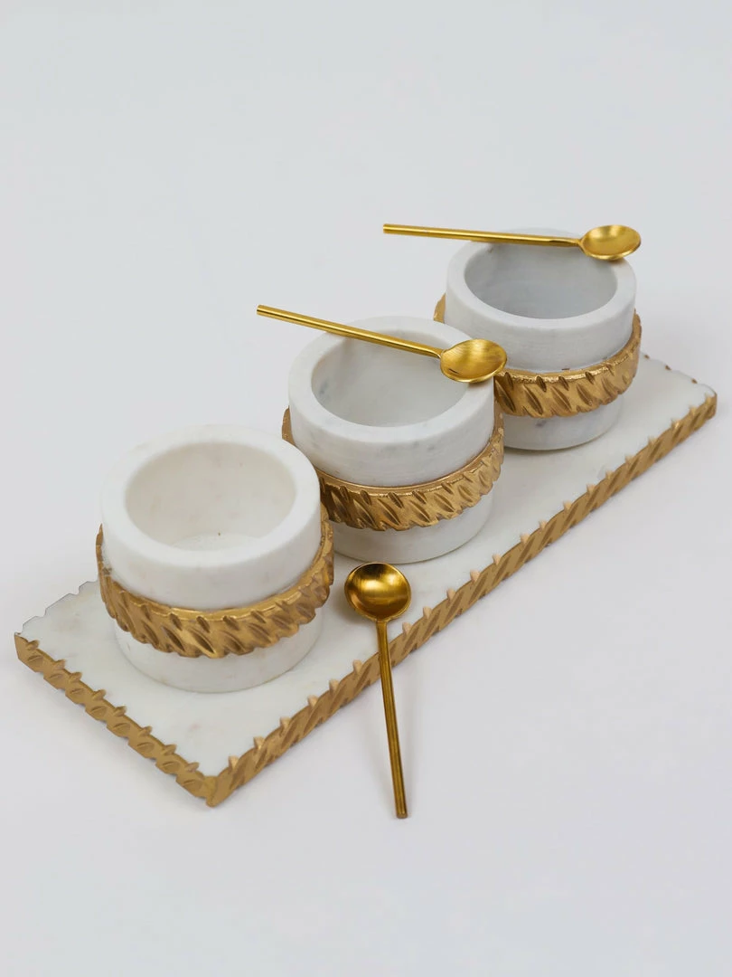 Description: This marble 3 bowl and tray set is perfect to display your favorite spices! It will take your serveware to the next level.