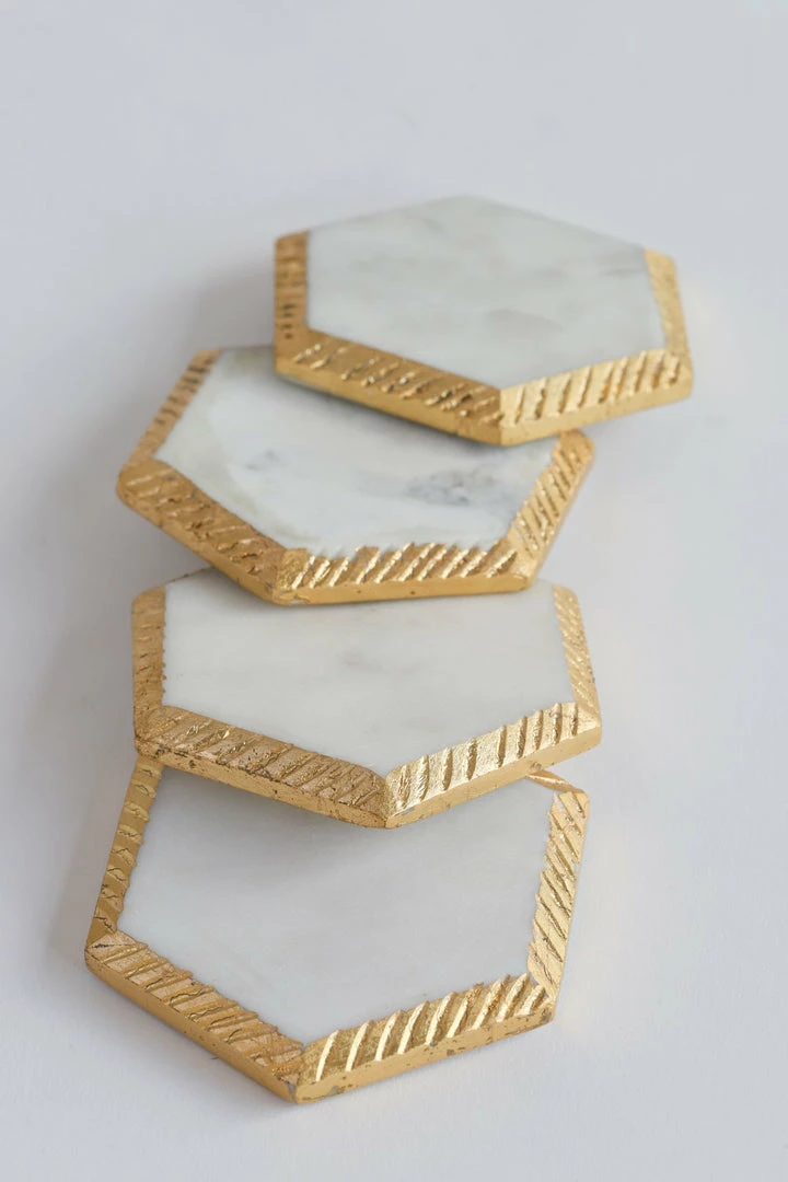 Description: These beautiful white marble hexagon coasters are a perfect accent for your coffee table! Complete with a hammered texture edge and a metallic finish!