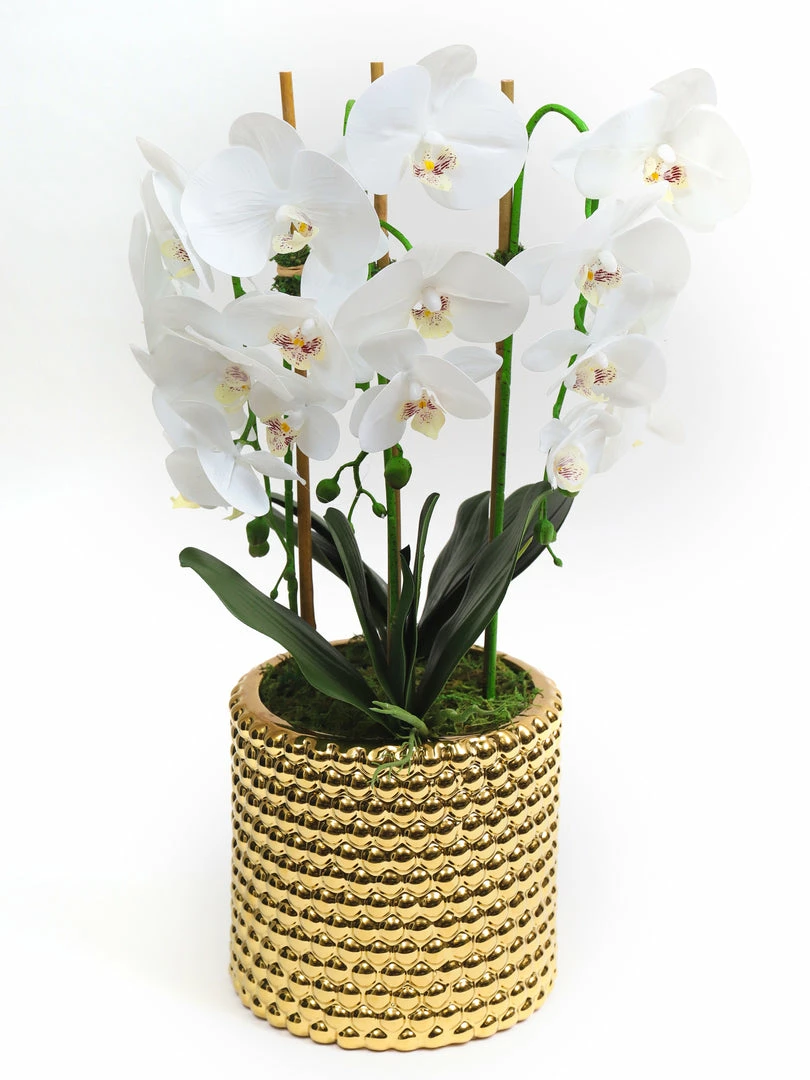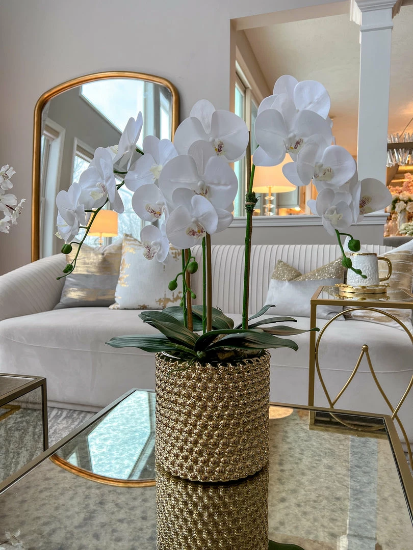 Description: This white potted faux Orchid is simply stunning! The gold detailed pot is perfect to match the rest of your home’s decor. This is perfect for anywhere in your home.