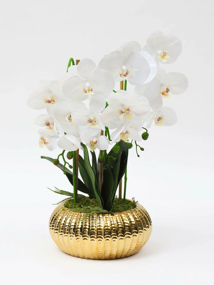 Description: This white potted faux Orchid is beautiful! The gold circle pot is perfect to match the rest of your home’s decor. Place anywhere in your home to display.