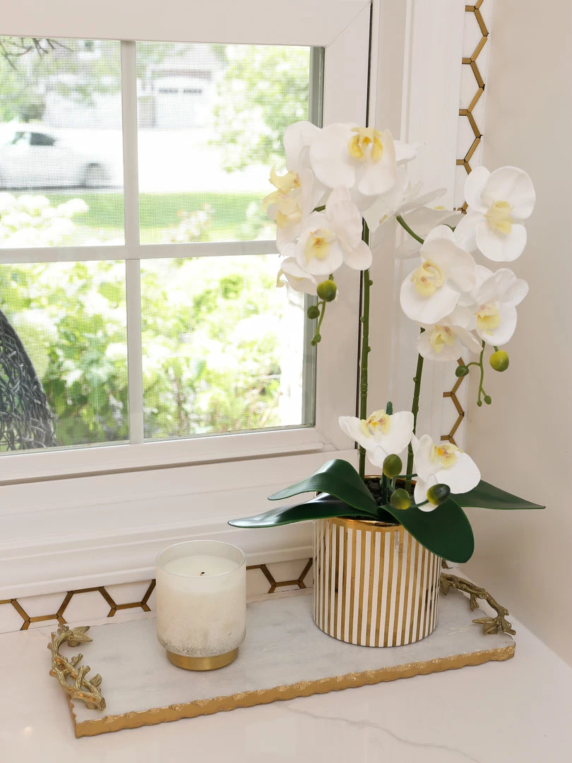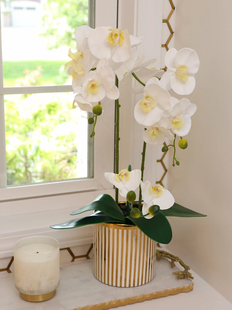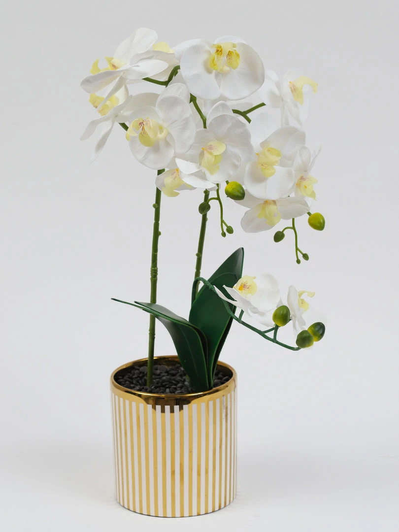 Description: This stunning orchid arrangement is a timeless piece. The elegant white orchids are gracefully frames in a gold and white striped ceramic vase to add to the beautiful design.