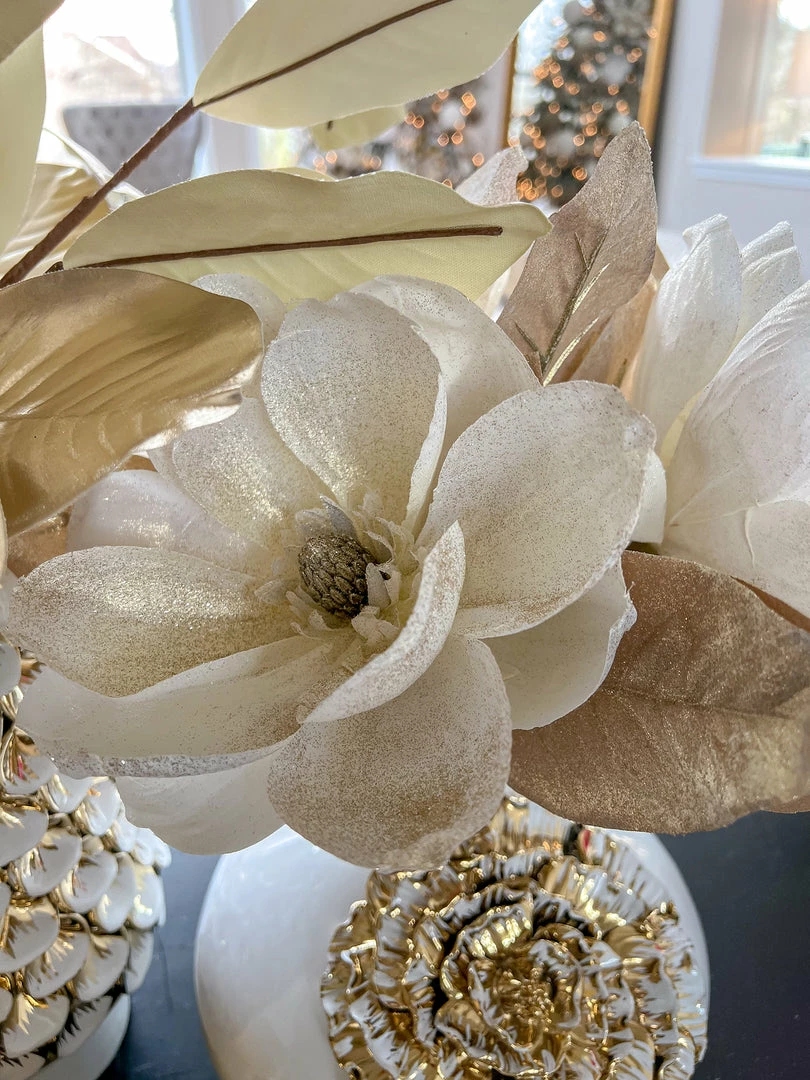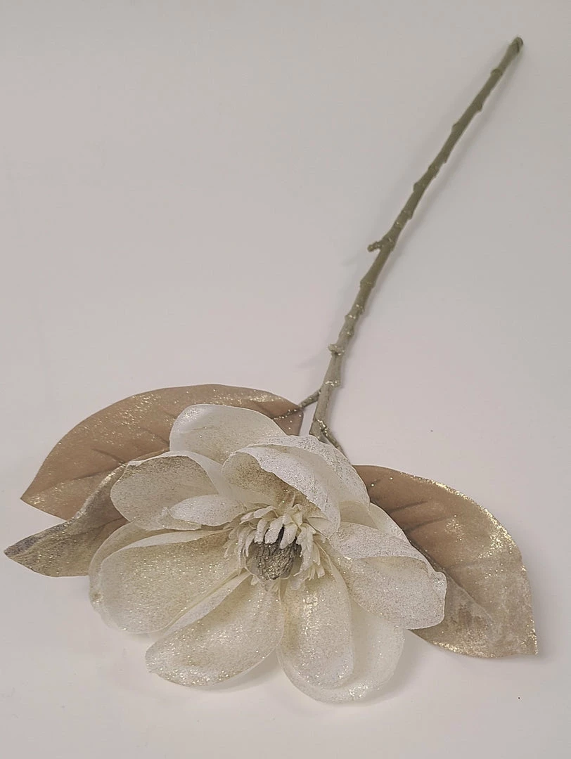 Description: This beautiful faux white magnolia will add sparkle to your holiday display or during any season! The stunning color will add a pop of color to any room.