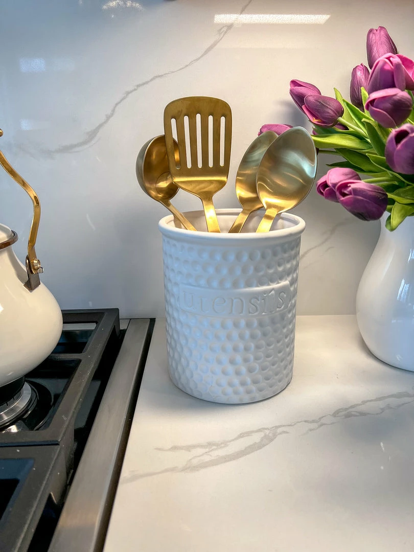 Description: This all white, indented patterned utensil holder is a very cute addition to your kitchen! Fill it with your favorite utensils and server sets for an elevated yet practical look.